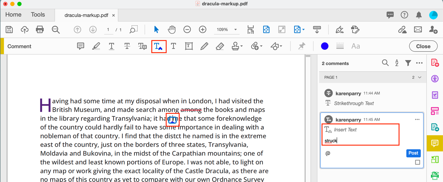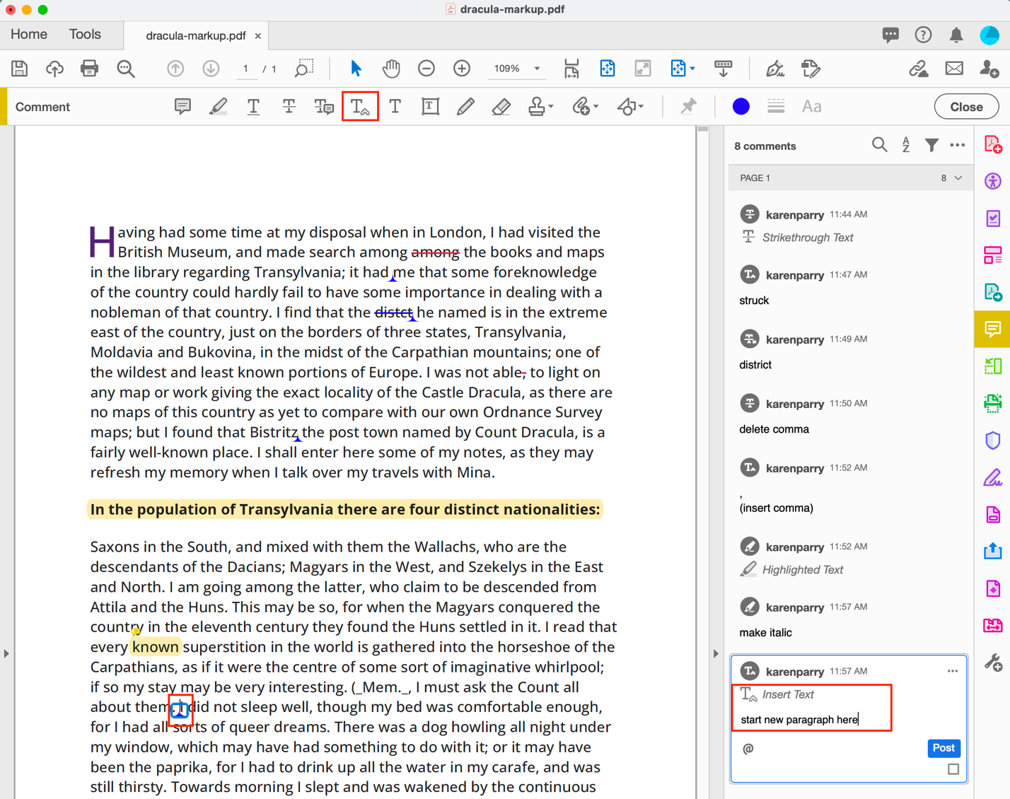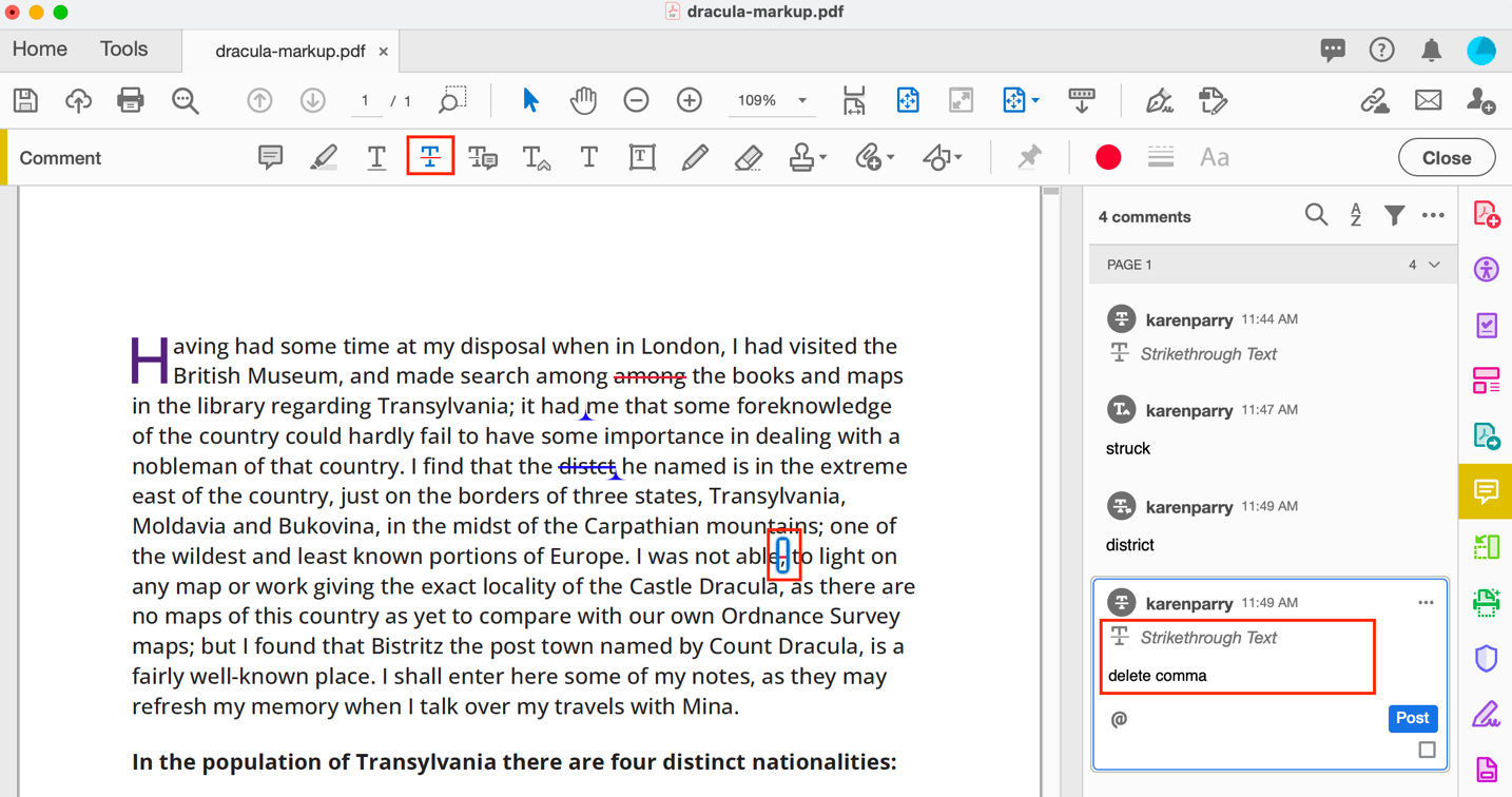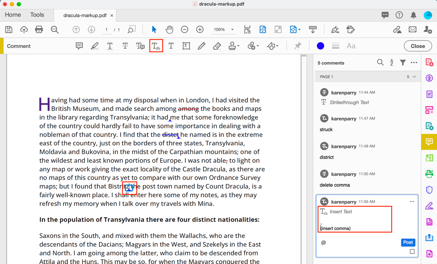 For example, as shown below, if you want a comma added, select the STRIKETHROUGH TEXT icon and then select the content you wish to delete and add a note eg. “delete comma” into the right side navbar.