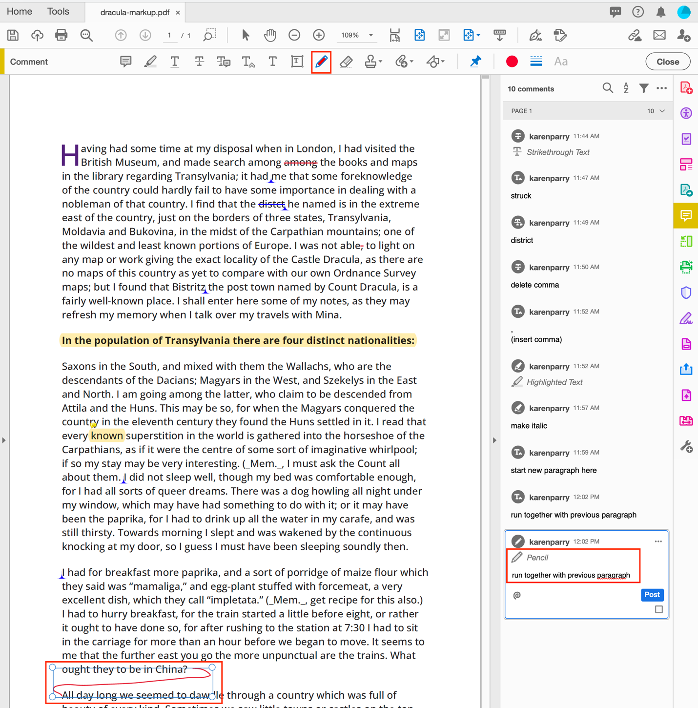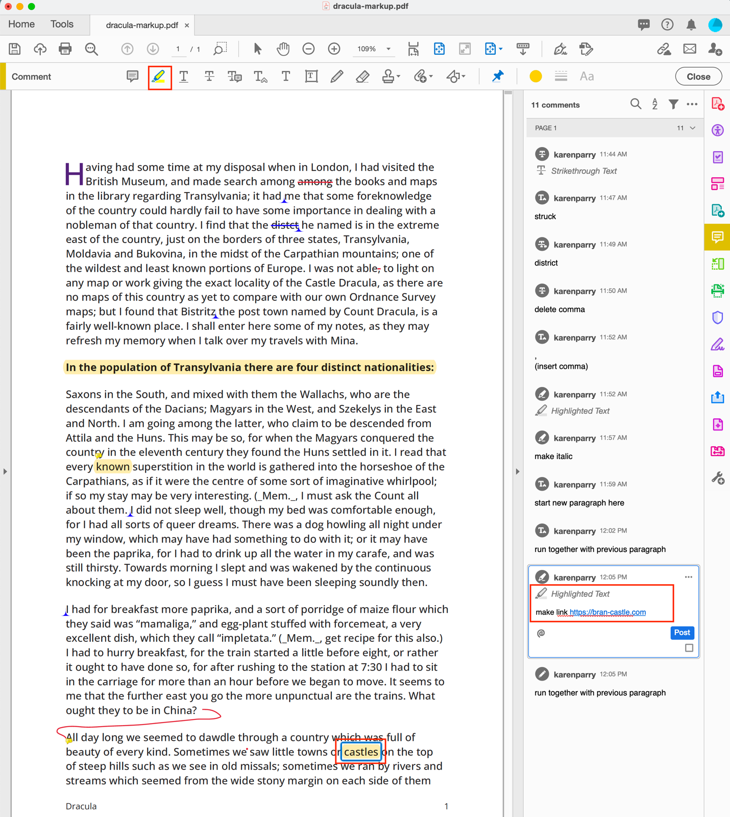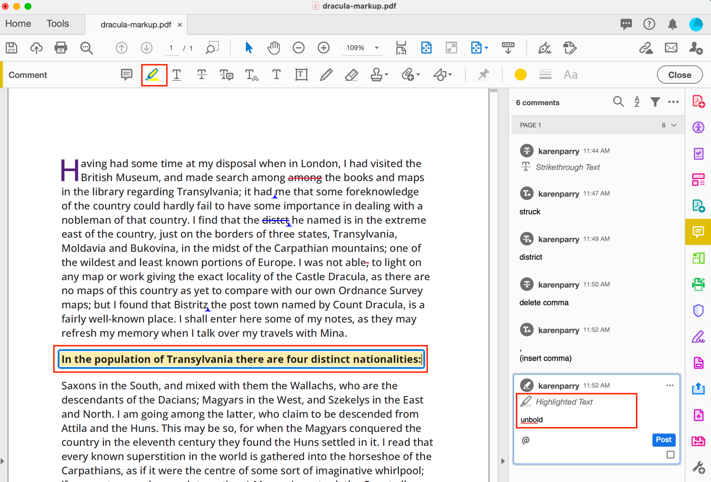 For example, as shown below, if you want a comma added, select the STRIKETHROUGH TEXT icon and then select the content you wish to delete and add a note eg. “delete comma” into the right side navbar.