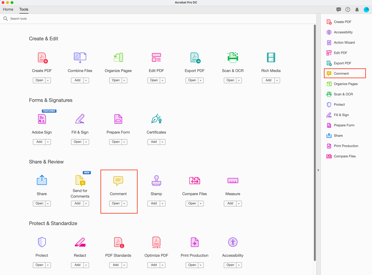 Select ADD under the COMMENT icon to add it to the right side navbar.