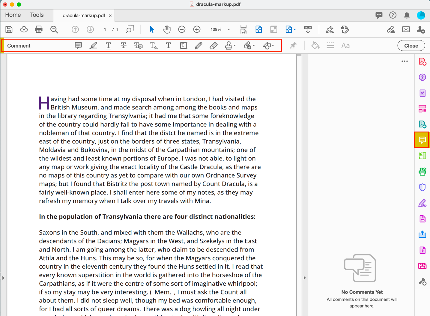 Open the right side navbar in Adobe Acrobat. Click on the COMMENT icon (looks like a “speech box”) to show all the COMMENT tools (along the top of the page).