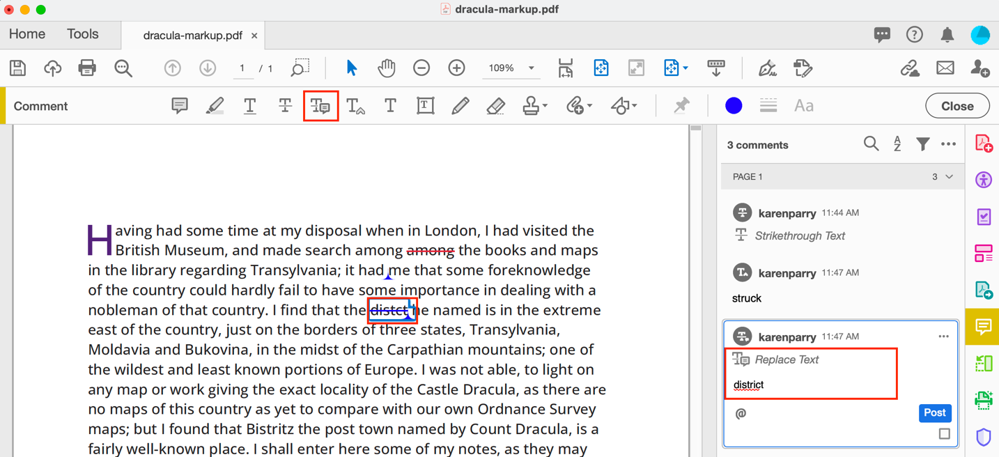 To replace a word (or words). Select the ADD NOTE TO REPLACE TEXT icon and then select the text you want to replace and type the new content into that entry in the right side navbar.