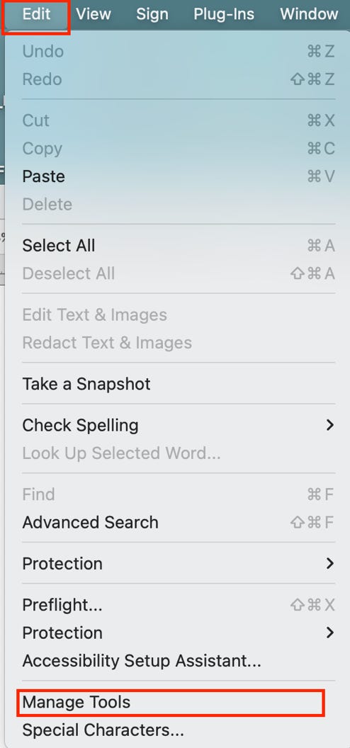 If the COMMENT icon isn’t in the right navbar, you will want to add it. Go to EDIT –> MANAGE TOOLS.