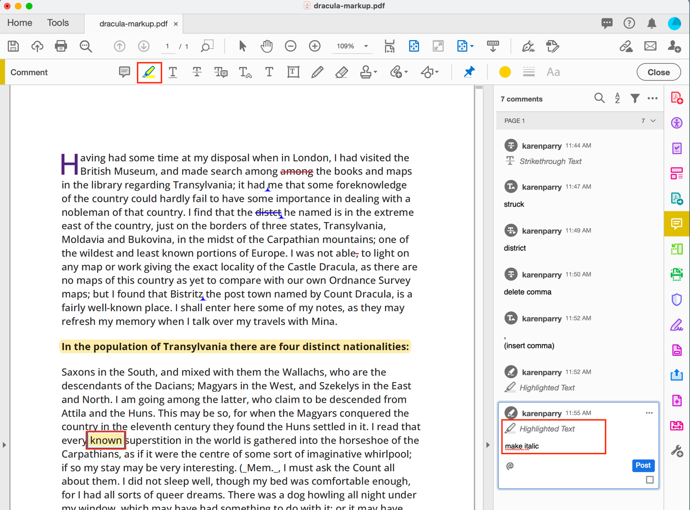 For example, as shown below, if you want a comma added, select the STRIKETHROUGH TEXT icon and then select the content you wish to delete and add a note eg. “delete comma” into the right side navbar.